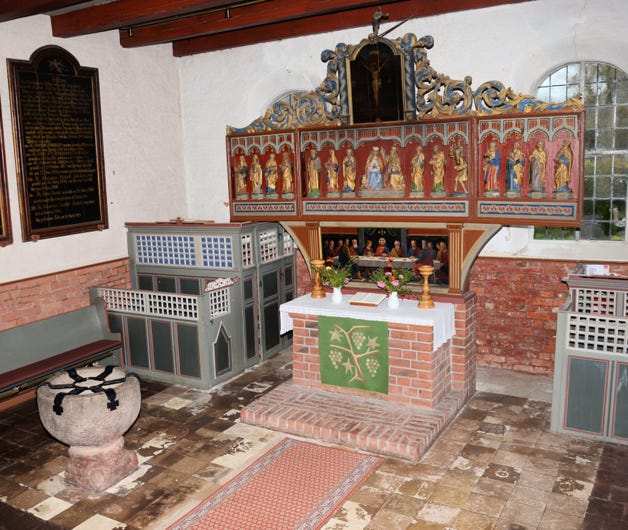 Weltenherrscher mit der Weltkugel, der seine Mutter zur Himmelkönigin erhebt. Auf der Predella, die ursprünglich der Reliquienaufbewahrung diente, befindet sich ein 1916 geschaffenes Abendmahlsbild des Deezbüller Malers Carl Ludwig Jessen, auf dem der Maler sich selbst dargestellt hat. Im Altarschrein befinden sich von zwei Ausnahmen abgesehen (Quirinus mit Mühlstein und Christophorus mit Christuskind) die Jünger Jesu als Apostel. Über dem Schrein befindet sich ein Aufbau (Altarbekrönung, Gesprenge) mit einer Kreuzigung und ganz oben eine Christusstatuette, die Christus den Überwinder des Todes zeigt.