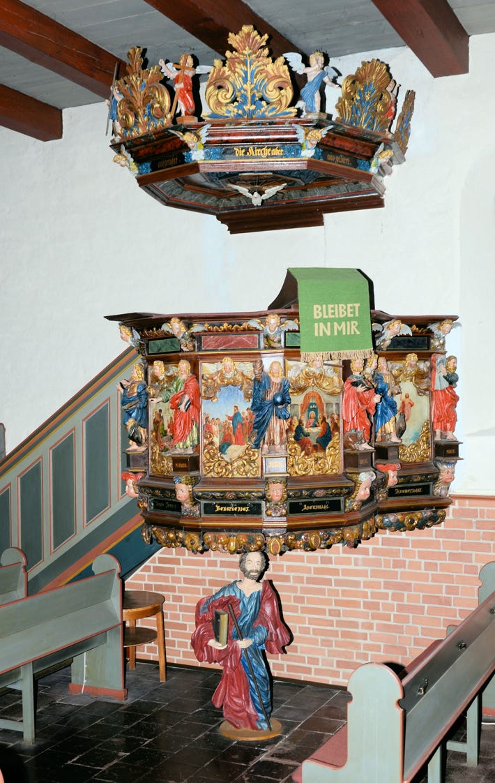 Die Orgelempore zeigt in schlichter Felderteilung Christus, Johannes den Täufer, Paulus und die zwölf Apostel. Ein Luther-Bild (Öl, von Carl Friedrich Kroymann, geb. 1781 in Eckernförde – gest. 1848 in Hamburg) und eine Liedertafel aus dem 19. Jh. hängen an der Nordwand der Orgelempore.